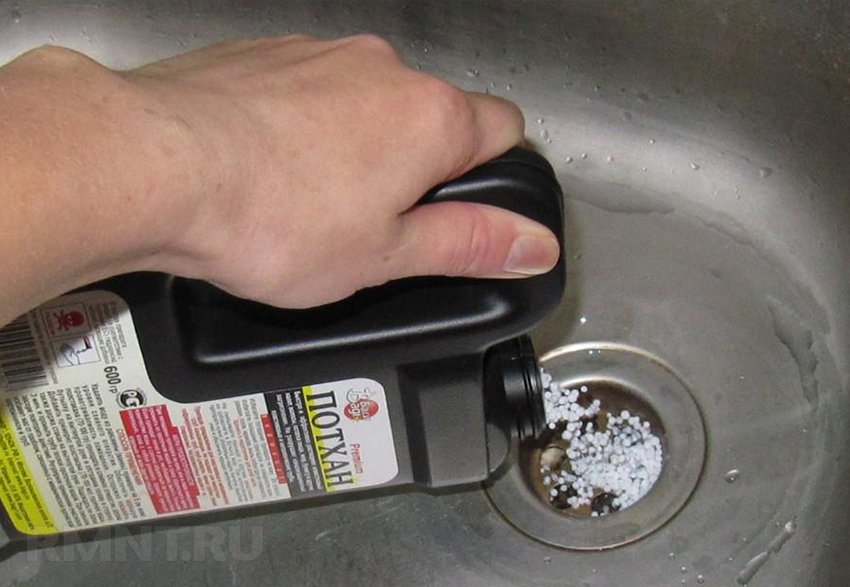 Заливка реагентов горячей водой для начала реакции и очистки канализационных труб в итоге.